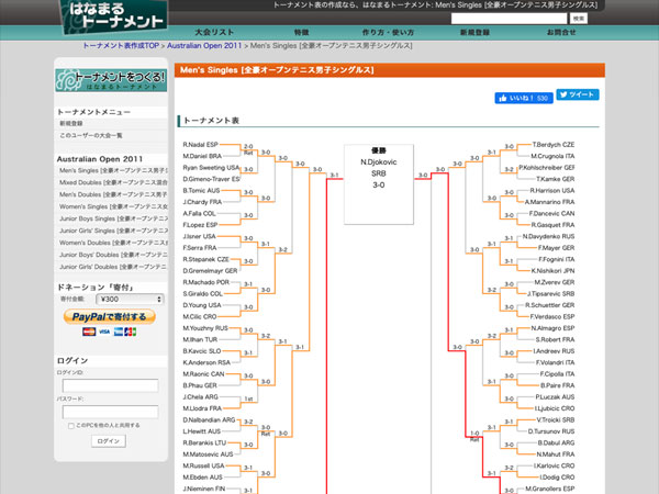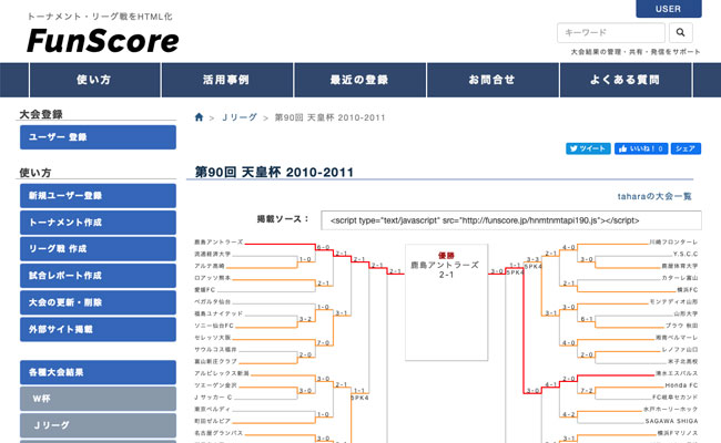 このサイトで登録して作ったトーナメント表やリーグ対戦表はjavascriptでブログやサイトに貼ることができます。